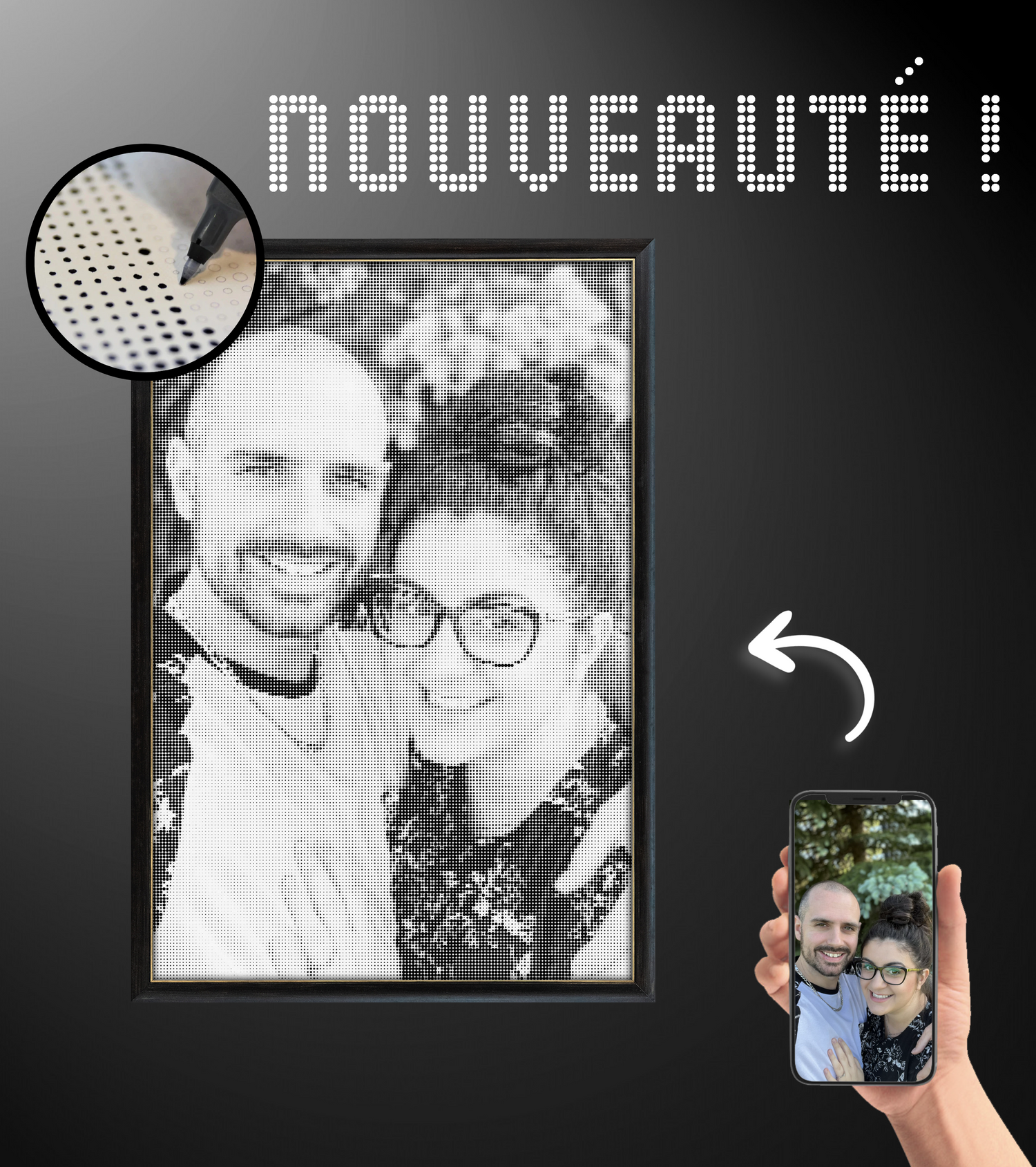 Découvrez la peinture pointilliste personnalisée, une activité créative relaxante qui vous permet de recréer votre photo préférée à l’aide de milliers de petits points à remplir à l'aide d'un crayon noir.